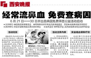 国外调查表明,在整个人群中,约60%的人在其一生中至少曾发生过一次鼻出血。鼻出血不仅发病率高,而且可对机体造成严重损害,如失血性贫血、休克、脑血管意外、窒息,严重者可有生命危险。夏季空气干热,更是鼻出血的高发季节。为此,中国五官健康基金会联合西安晚报、华商报、西安新城中大耳鼻喉医院共同发起了一场“鼻子保卫战” ——流鼻血病因筛查公益活动,为保卫我们的鼻子而共同战斗。