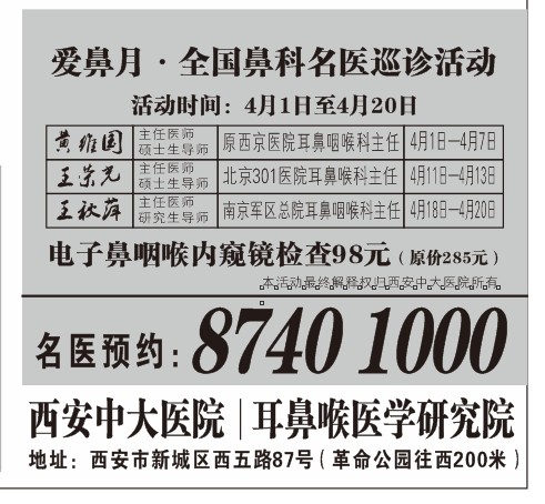 值 爱鼻日之际,为了引起公众对呼吸健康和鼻部疾病的关注,由华商报、西安晚报、中国五官健康基金会联合举办的【2014 爱鼻月公益筛查暨 鼻科名医巡诊活动】盛大开启,活动旨在提高人们的对耳鼻喉健康防范意识,更多关注自身的耳鼻喉健康问题。活动期间不仅有知名耳鼻喉医生坐诊,更有多项鼻病筛查项目优惠。名额有限,快速报名吧!预约电话:029-87401000