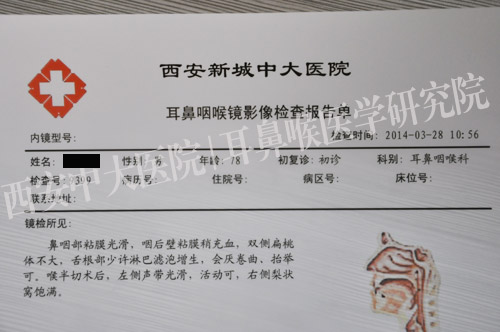 鉴于文先生的临床症状以及常年吸烟并伴有嗜酒习惯,来长荣主任医师建议采用喉镜检查,并告诉会有一些咽部的不适。经纤维喉镜检查,文先生喉部咽红,扁桃体2度,咽喉部淋巴增生,会厌充血,梨状窝表面有新生物,声带闭合不佳。对可疑病变组织,来长荣主任医师采取了纤维鼻咽镜下行喉部活检,送病理检查。通过喉部活检发现癌细胞,为了解喉部恶性肿瘤的大小以及是否扩散,来长荣主任医师又要文先生增加一些检查,像X光、CT,从而确诊文先生换喉部恶性肿瘤的事实。