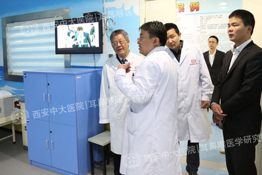会议间隙,西安新城中大耳鼻喉医院院长来长荣主任医师带耳鼻喉头颈外科王荣光教授参观了中大耳鼻喉科室、理疗室、儿童房等。在耳鼻喉病房,王荣光教授查看了住院病人的病历并到监护室进行了指导,对中大的住院条件以及高标准的手术室大加赞赏,并就建立加强与中大定期进行学术交流达成共识。