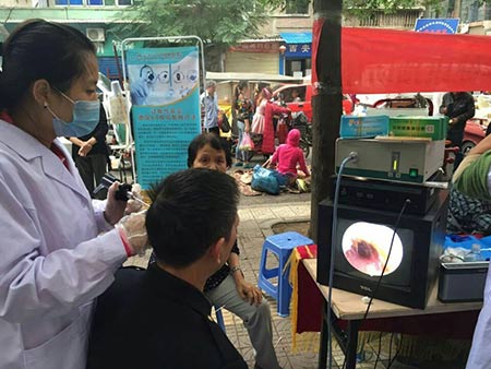 蒸汽腾腾、吆喝四起,四周充斥着讨价声、肉香味、拥挤人潮。在这片烟火气十足的闹市里,义诊横幅静立一偶,默默肃立的接待着来诊的人群。这,是9月24日西安新城中大耳鼻喉医院于未央宫明宫社区的义诊场景。