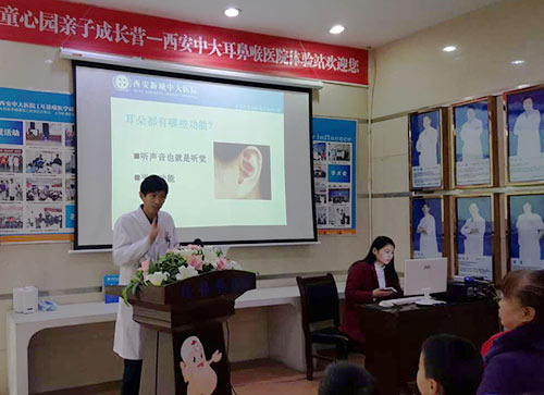 活动项是耳鼻喉基本知识讲课。西安新城中大耳鼻喉医院医生贠根远主任特别担任本次讲课老师。贠根远主任用浅显化的语言为小朋友们讲述了一个又一个具体而生动的耳鼻喉健康基本知识。小朋友们也被新奇的讲课内容所吸引,表现得十分专注。