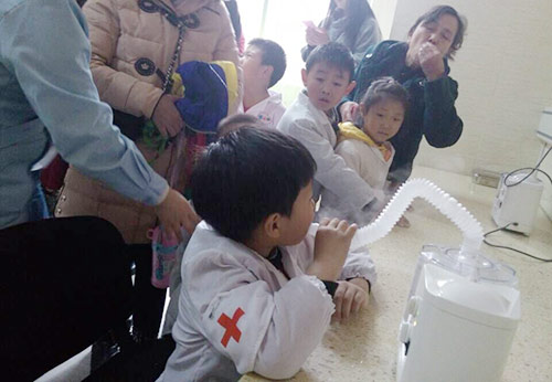 带领小朋友们了解并上手操作了耳鼻喉科的基本检查后,每组医护人员又领着小朋友进入雾化室。医护人员手把手教小医生装药,为小朋友讲解如何操作。小朋友互相尝试做雾化,表现得十分雀跃。