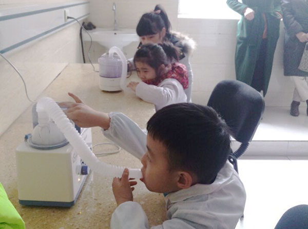 除了替父母做检查,小朋友们自己也各自尝试了一次咽部雾化操作,为咽喉做了个小保健。