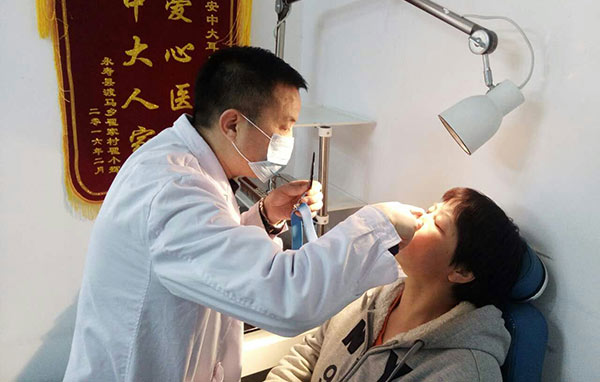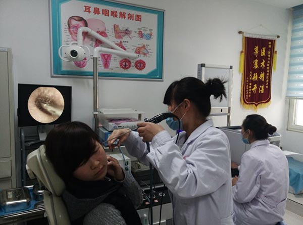 西安新城中大耳鼻喉医院专家正在为聋人朋友检查